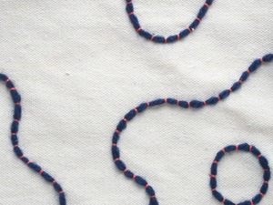 ネイビーの毛糸とオレンジ色の糸でステッチしています。