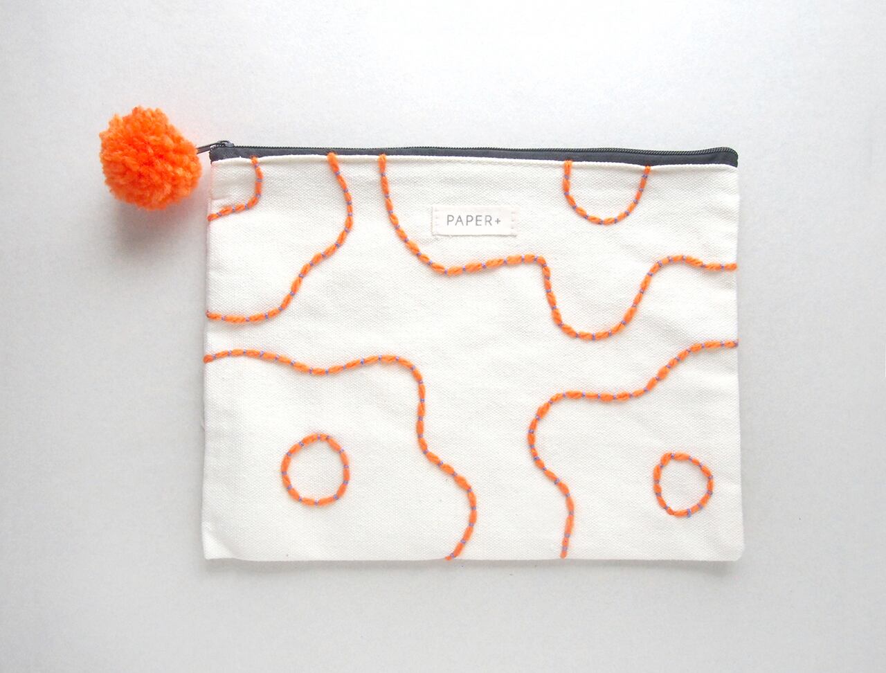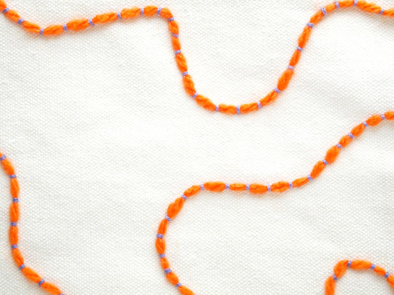 オレンジの毛糸とブルーの糸でステッチしています。