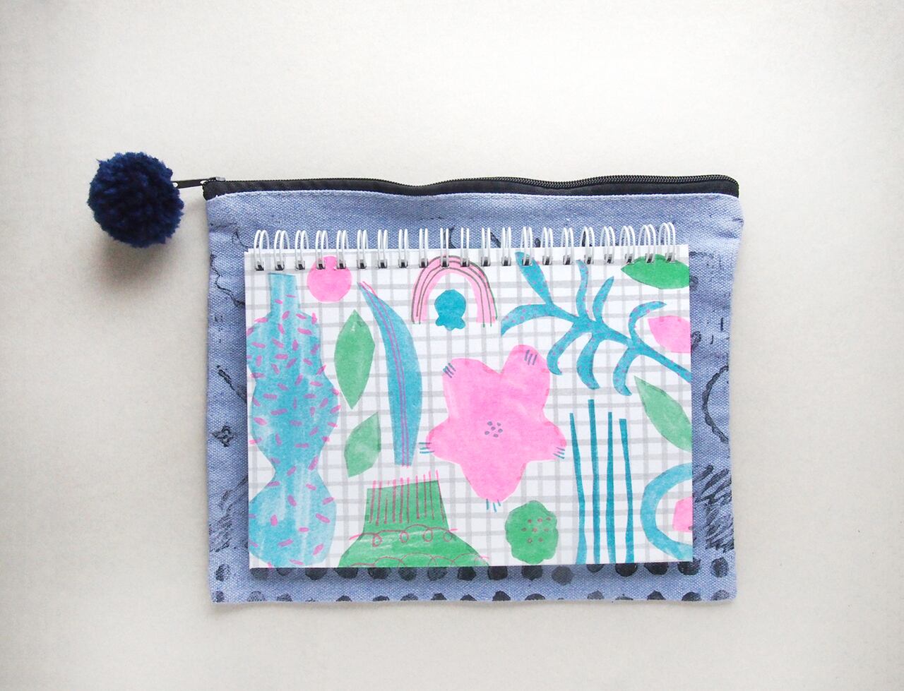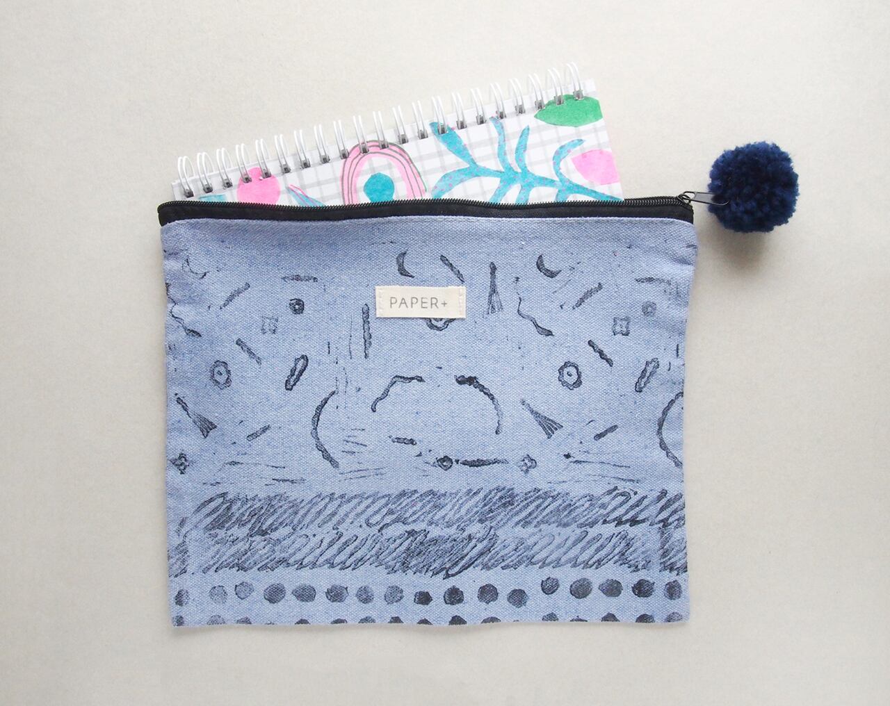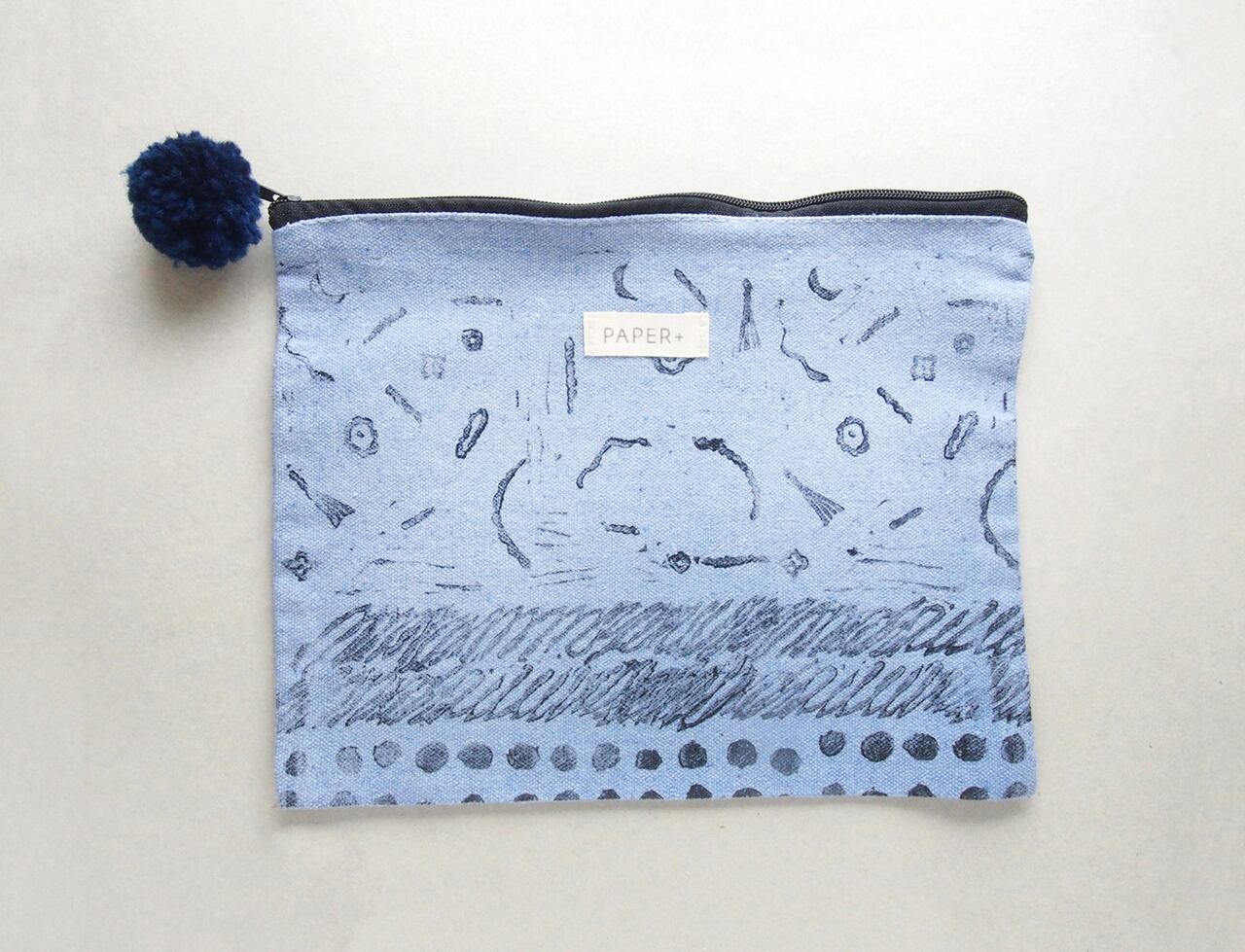 ノート用ポーチ/手染め+手刷りプリント ブルー×ブルーポンポン
